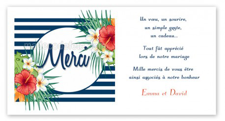 Pourquoi pas utiliser ce nouveau thème pour un baptême de petite fille, non ? Car avec les fleurs tropicales, la carterie présentée sur Madecodefete révèle des fleurs en motifs et associées aux rayures marines et blanches cette décoration pour un baptême sera aussi bien utilisée pour un garçon que pour une fille !