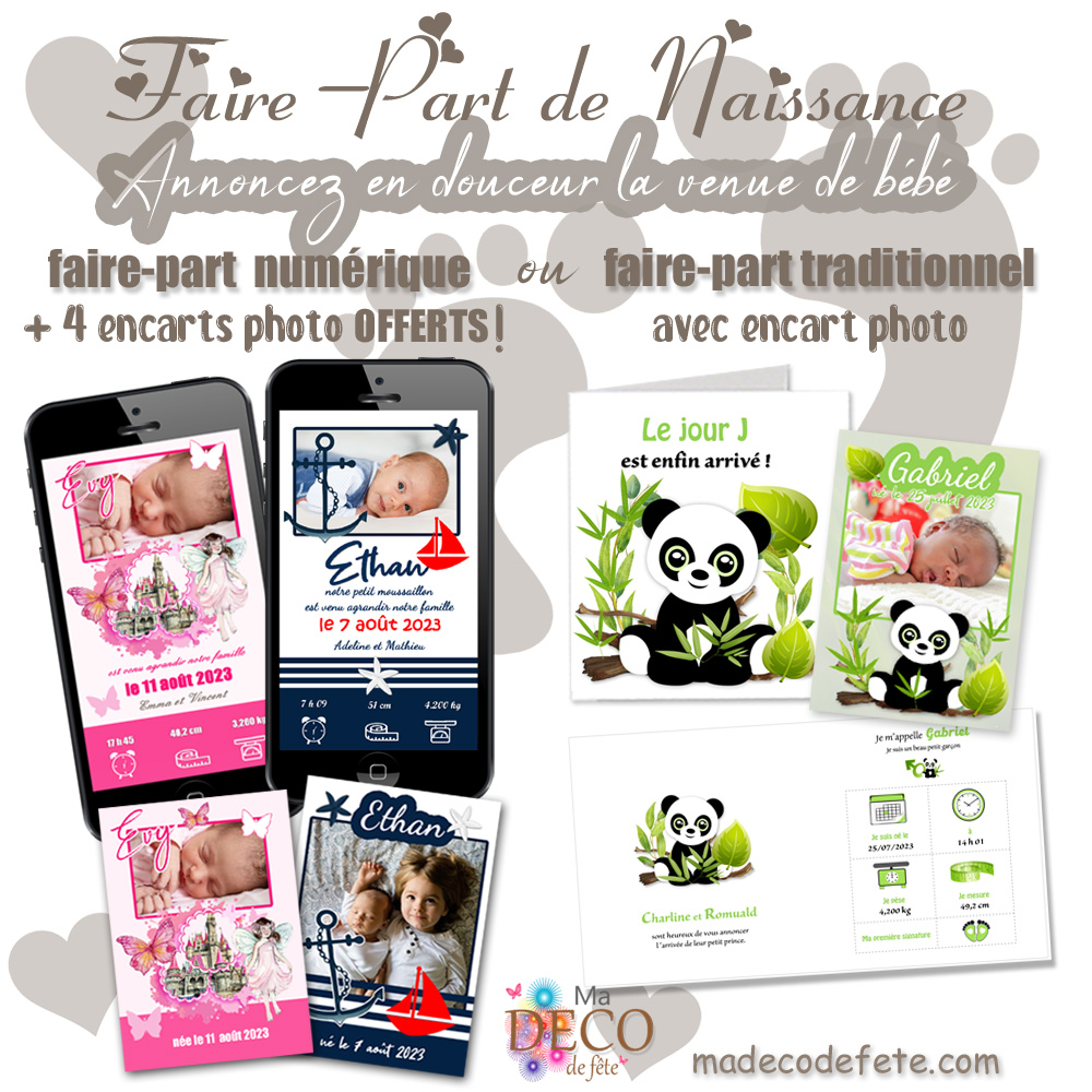 Sur Madecodefete vous y trouverez plein d’idée de faire-part de naissance et vous serons personnalisé avec beaucoup de soins et d’attention par notre équipe d’expert en texte et mise en page.