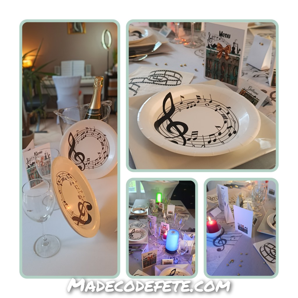 Voici comment présenter un thème déco “Musique” en t’inspirant de ce que l’on peut trouver et associer via madecodefete.com, tout en créant une ambiance cohérente, élégante et facile à mettre en place.